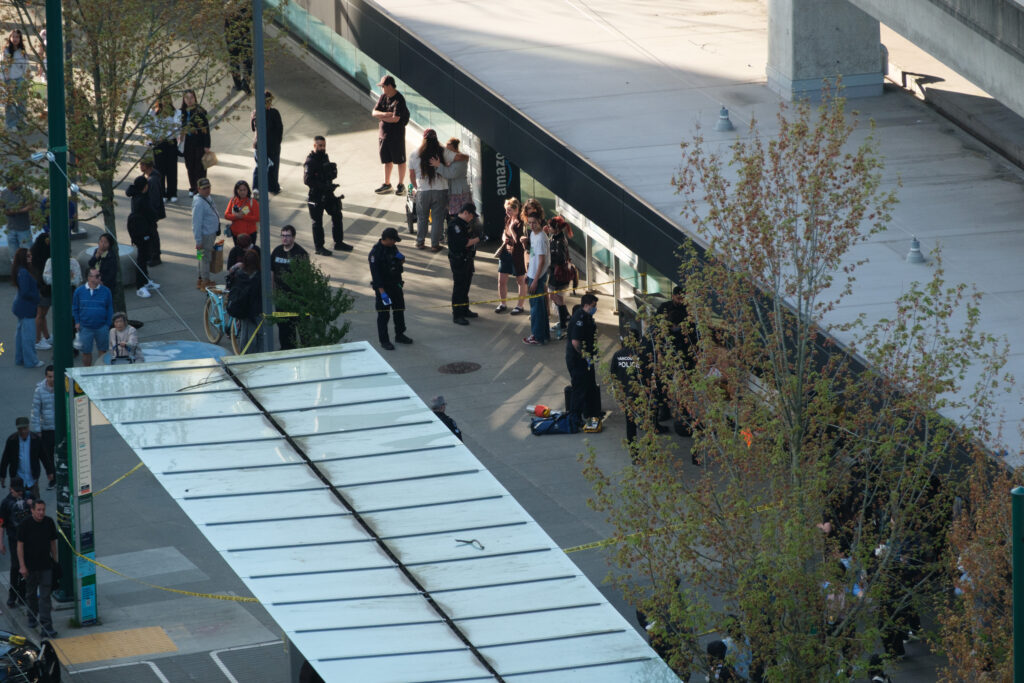 Police officers seem to have taped off an area outside the station, near the entrance to the station and next to the waiting area for the R4 bus going to UBC.